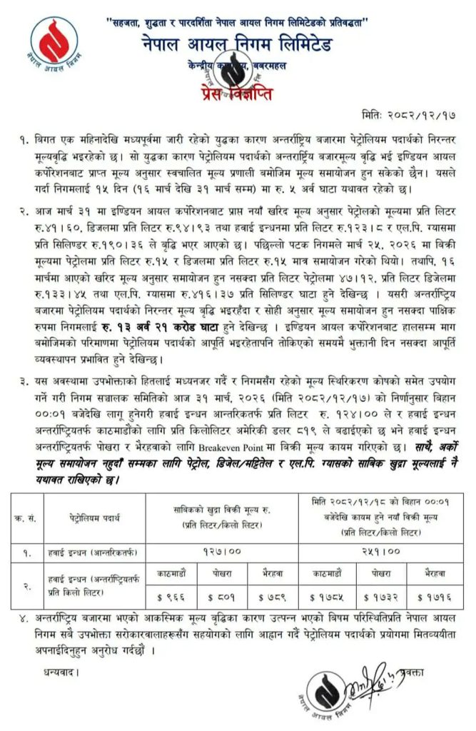 नयाँ दरअनुसार पेट्रोल प्रतिलिटर ४१ रुपैयाँ र डिजेल प्रतिलिटर ९४ रुपैयाँसम्म महँगो भएर आएको छ । विशेषगरी डिजेलमा देखिएको यो वृद्धि पछिल्ला समयकै उच्चमध्ये एक मानिएको छ भने पेट्रोलको मूल्य पनि उल्लेखनीय रूपमा बढेको छ ।