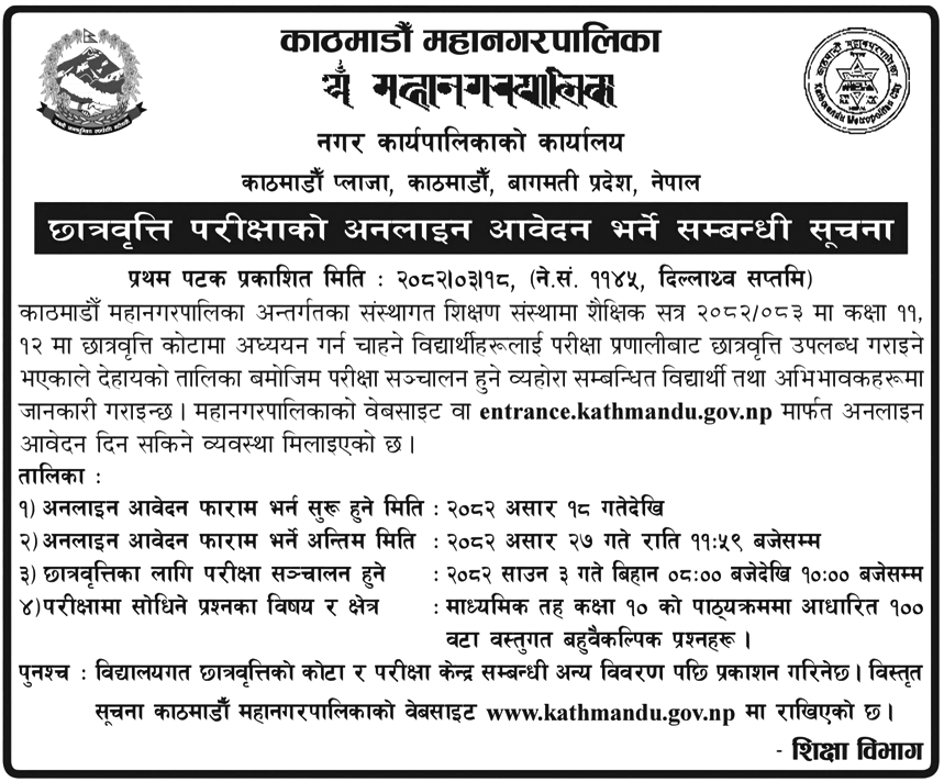 छात्रवृत्तिका लागि लिइने छनोट परीक्षा साउन ३ गते बिहान ८ बजेबाट १० बजेसम्म सञ्चालन हुने जानकारी महानगरले दिएको छ ।