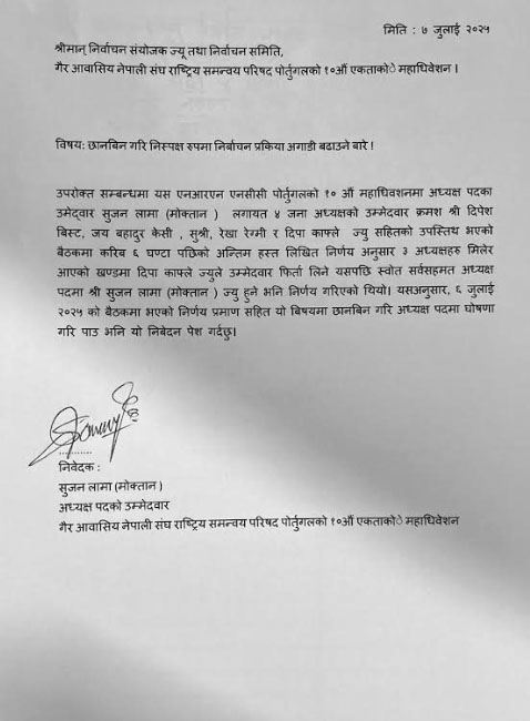 गत जुलाई ६ मा पोर्चुगलमा एनआरएनए एनसिसीको निर्वाचन मिति तोकिएको थियो । अध्यक्ष पदका लागि पाँचजनाले उम्मेदवारी दिएका थिए । यद्यपि, दीपा काफ्लेले आफ्नो प्रतिस्पर्धीहरूमध्ये चारजनाको बीचमा सहमति भएमा आफू पद त्याग्न तयार हुने भनाइ सार्वजनिक गरेपछि तीन अन्य उम्मेदवार (दीपेश विष्ट, जया बहादुर केसी र रेखा रेग्मी) ले सुजनको पक्षमा सहमति जनाउँदै हस्ताक्षर गरेका थिए ।