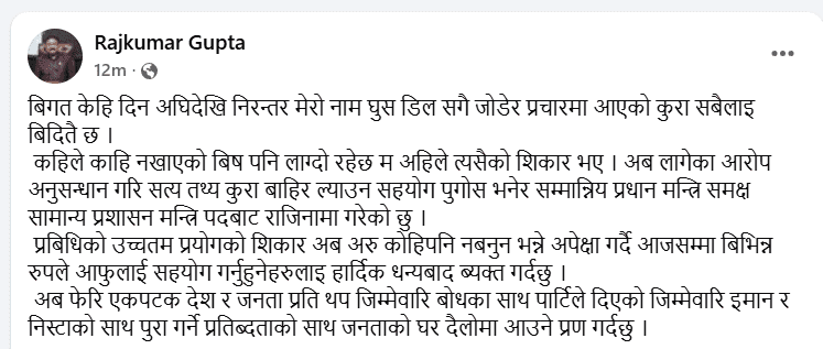 ‘केही दिनयता मेरो नाम घुस प्रकरणसँग जोडेर व्यापक प्रचार गरिएको छ,’ उनले फेसबुकमा लेखेका छन्, ‘कहिलेकाहीँ नखाएको विष पनि लाग्दो रहेछ । म अहिले त्यही परिस्थितिको सिकार भएको छु । सत्य बाहिर ल्याउन अनुसन्धानको मार्ग खुलोस् भनेर राजीनामा दिएको छु।’