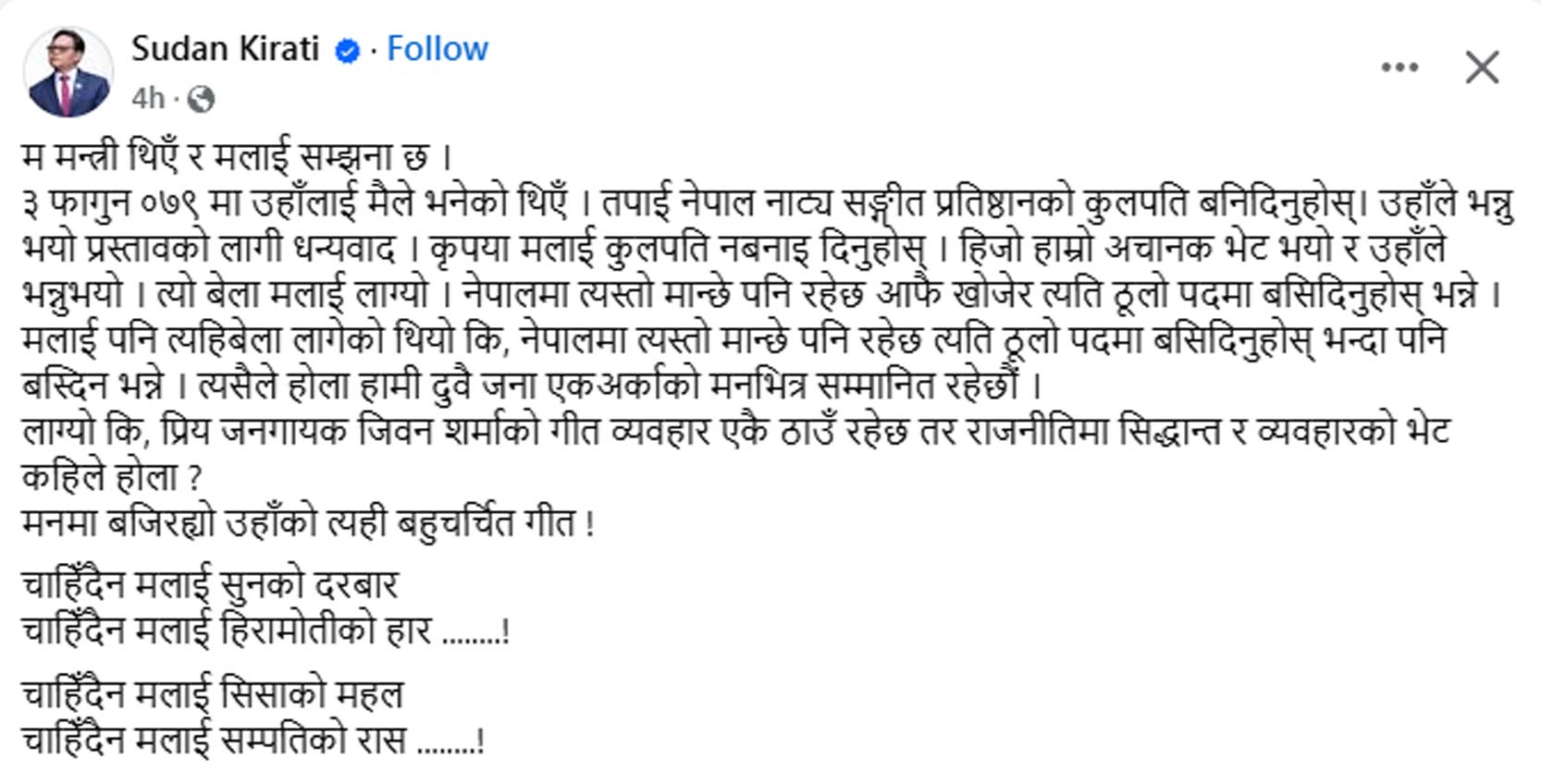 हालै भएको आकस्मिक भेटको सन्दर्भ दिँदै पूर्वमन्त्रीले थप लेखेका छन्, ‘हिजो हाम्रो अचानक भेट भयो र उहाँले त्यही प्रसङ्ग सम्झनुभयो । मलाई फेरि त्यही कुरा स्मरण भयो— सिद्धान्त र व्यवहार सँगसँगै हिँड्न सक्ने पात्रहरू अझै बाँकी छन् ।’