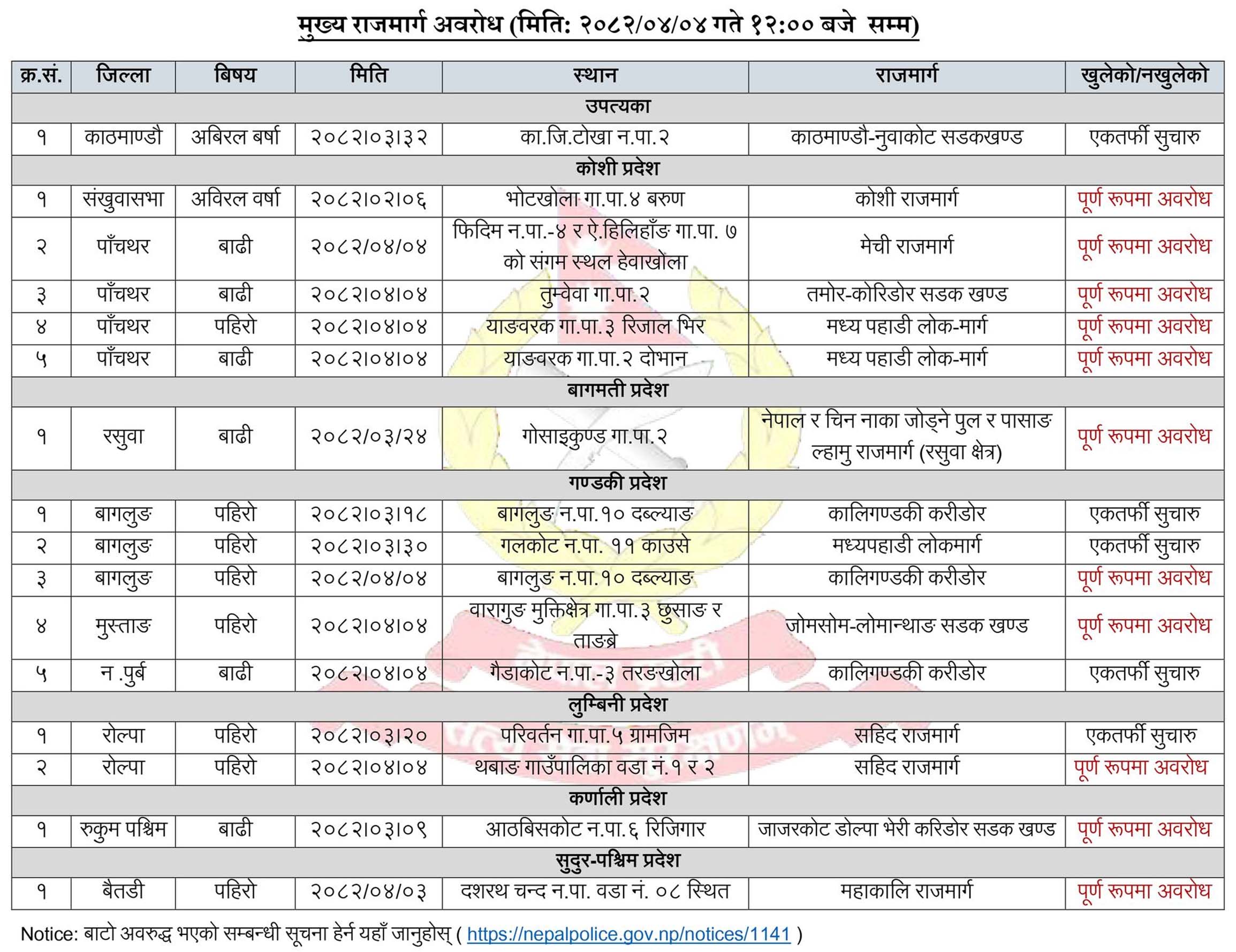 प्रहरी प्रधान कार्यालयले यात्रुहरूलाई आवश्यक नभएसम्म पहिरो प्रभावित सडक प्रयोग नगर्न र वैकल्पिक मार्ग छनोट गर्न आग्रह गरेको छ । साथै, सडकको अवस्था बुझेरमात्र यात्रा थाल्न आग्रह गरिएको छ ।