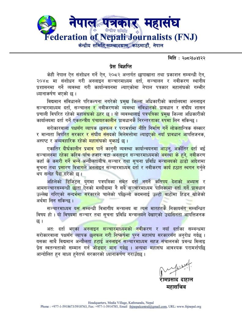 नेपाल पत्रकार महासङ्घले बिहीबार विज्ञप्ति जारी गर्दै यो निर्णय संविधानको मर्म र संघीय संरचनाविपरीत भएको बताउँदै कडा आपत्ति जनाएको हो । महासङ्घका अनुसार सञ्चारमाध्यमको दर्ता तथा नवीकरणको जिम्मा सीडीओलाई दिने प्रावधान एकतन्त्रीय पञ्चायती अभ्यासको पुनरावृत्ति हो ।