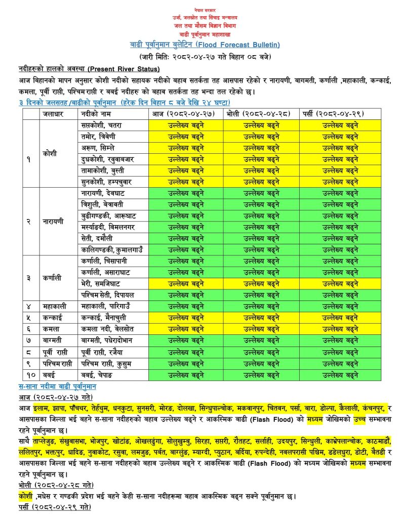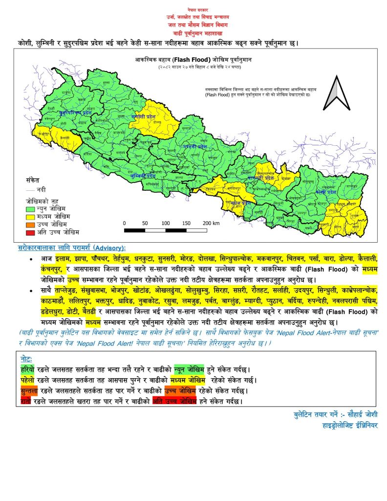 इलाम, झापा, पाँचथर, तेह्रथुम, धनकुटा, सुनसरी, मोरङ, दोलखा, सिन्धुपाल्चोक, मकवानपुर, चितवन, पर्सा, बारा, डोल्पा, कैलाली, कञ्चनपुर र आसपासका क्षेत्रमा बहने साना नदीहरूको बहाव उल्लेख्य बढ्ने र आकस्मिक बाढीको उच्च सम्भावना रहेको छ ।