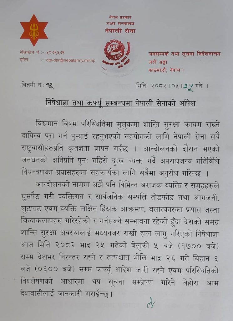 काठमाडौं । हाल देशभर फैलिएको विषम परिस्थितिलाई ध्यानमा राख्दै शान्ति सुरक्षा कायम राख्नका लागि सरकारले आज (भाद्र २५) बेलुका ५ बजेसम्म निषेधाज्ञा जारी गरेको छ भने त्यसपछि भोलि (भाद्र २६) बिहान ६ बजेसम्म कर्फ्यु आदेश लागू गरिने भएको छ । नेपाली सेनाले एक विज्ञप्ति जारी गर्दै यसबारे जानकारी दिएको हो ।