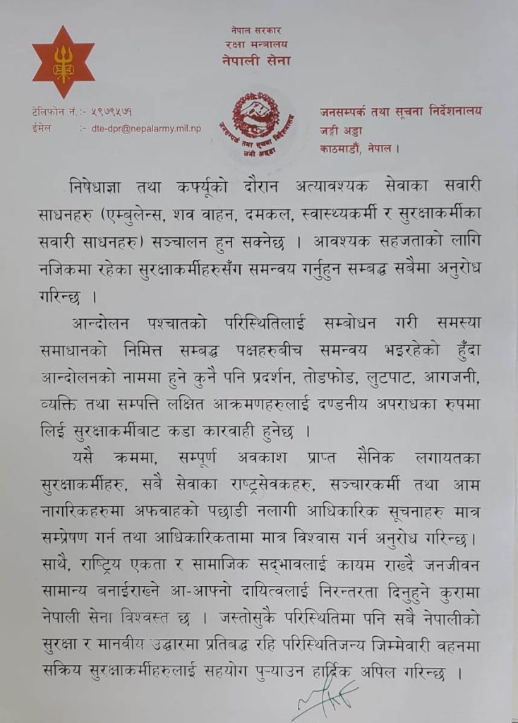 विज्ञप्तिमा सेनाले आन्दोलनका क्रममा भएको जनधनको क्षतिप्रति गहिरो दुःख व्यक्त गर्दै अपराधजन्य गतिविधि नियन्त्रणमा सबै नागरिकको सहयोग आवश्यक रहेको बताएको छ ।
