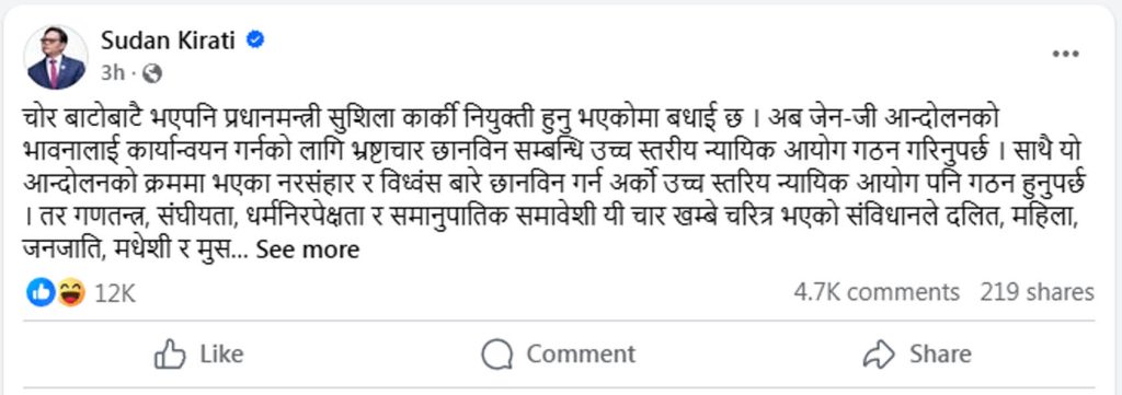 सामाजिक सञ्जालमार्फत उनले लेखेका छन्, “चोर बाटोबाटै भएपनि प्रधानमन्त्री सुशीला कार्की नियुक्त हुनु भएकोमा बधाई छ । अब जेनजी आन्दोलनको भावनालाई कार्यान्वयन गर्न भ्रष्टाचार छानबिन गर्ने उच्चस्तरीय न्यायिक आयोग गठन गरिनुपर्छ ।”