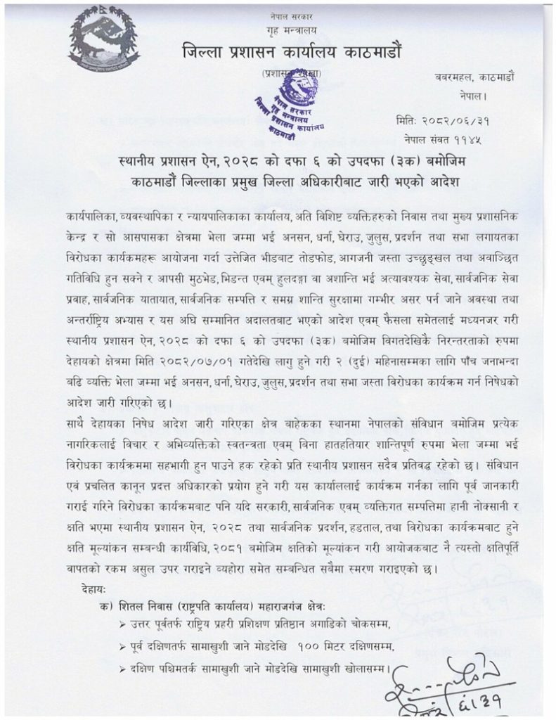 प्रमुख जिल्ला अधिकारी ईश्वरराज पौडेलले शुक्रबार जारी गरेको आदेशअनुसार शीतल निवास (राष्ट्रपति कार्यालय) महाराजगञ्ज क्षेत्र, हरित गृह (उपराष्ट्रपति कार्यालय) लैनचौर क्षेत्र, नारायणहिटी दरबार सङ्ग्रहालय परिसर, सिंहदरबार क्षेत्र तथा प्रधानमन्त्री निवास बालुवाटारलाई निषेधित क्षेत्र घोषणा गरिएको छ । यी क्षेत्रमा पाँच जनाभन्दा बढी व्यक्ति एकै ठाउँमा भेला हुन नपाउने स्पष्ट उल्लेख गरिएको छ ।