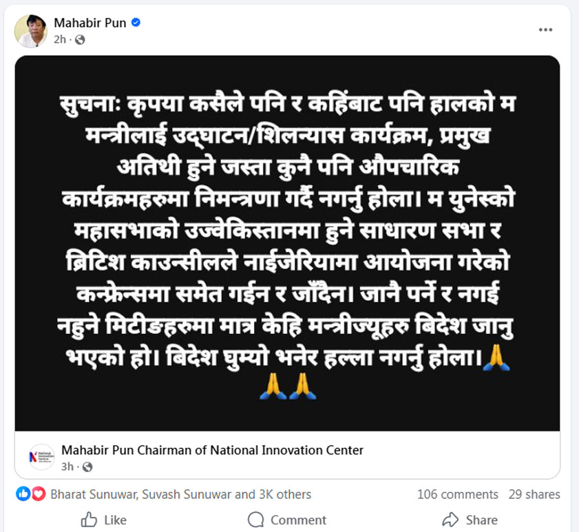 ‘कृपया कसैले पनि र कहिँबाट पनि हालको म मन्त्रीलाई उद्घाटन र शिलान्यास कार्यक्रम, प्रमुख अतिथि हुने जस्ता कुनै पनि औपचारिक कार्यक्रमहरूमा निमन्त्रणा गर्दै नगर्नु होला,’ पुनले लेखेका छन् ।