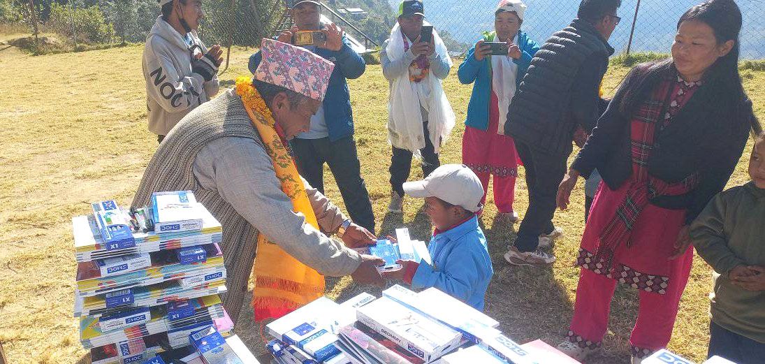 खिजिदेम्बा (ओखलढुंगा) । खिजिदेम्बा गाउँपालिका–५, निभारेस्थित श्री जनज्योति आधारभूत विद्यालयका बालविकासदेखि कक्षा ८ सम्म अध्ययनरत विद्यार्थीहरूलाई सोनम गिर्मी फ्यामिली फाउन्डेसनको आयोजनामा स्टेशनरी सामग्री वितरण गरिएको छ ।