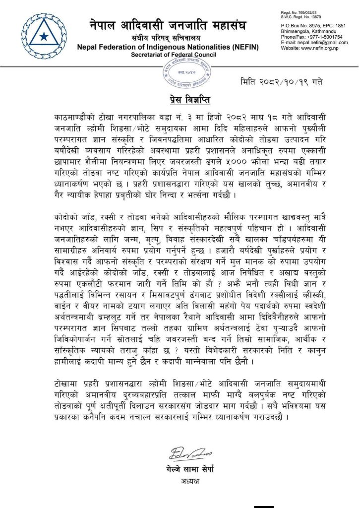 आदिवासी महिलाले उत्पादन गरेको परम्परागत तोङ्बा नष्ट गरिएको घटनाप्रति नेफिनको कडा आपत्ति