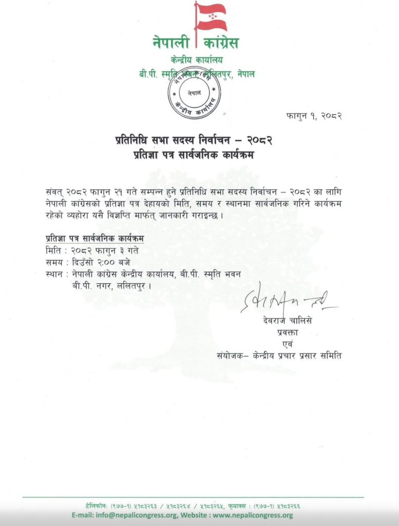 जारी सूचनाअनुसार प्रतिज्ञापत्र सार्वजनिक कार्यक्रम आगामी फागुन ३ गते दिउँसो २ बजे पार्टीको केन्द्रीय कार्यालय, बी.पी. स्मृति भवन, बी.पी. नगर, ललितपुरमा आयोजना गरिनेछ । प्रतिनिधिसभा सदस्य निर्वाचन–२०८२ लाई लक्षित गर्दै तयार गरिएको प्रतिज्ञा–पत्र सोही कार्यक्रममा सार्वजनिक गरिने जनाइएको छ ।
