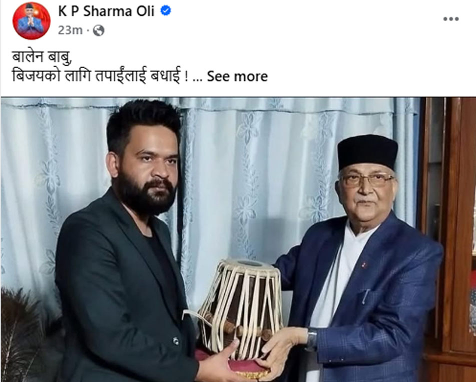ओलीले लेखेका छन्, “बालेन बाबु, विजयको लागि तपाईंलाई बधाई। तपाईंको पाँच वर्षे कार्यकाल निर्विघ्न सफल रहोस्, हार्दिक शुभकामना ।”