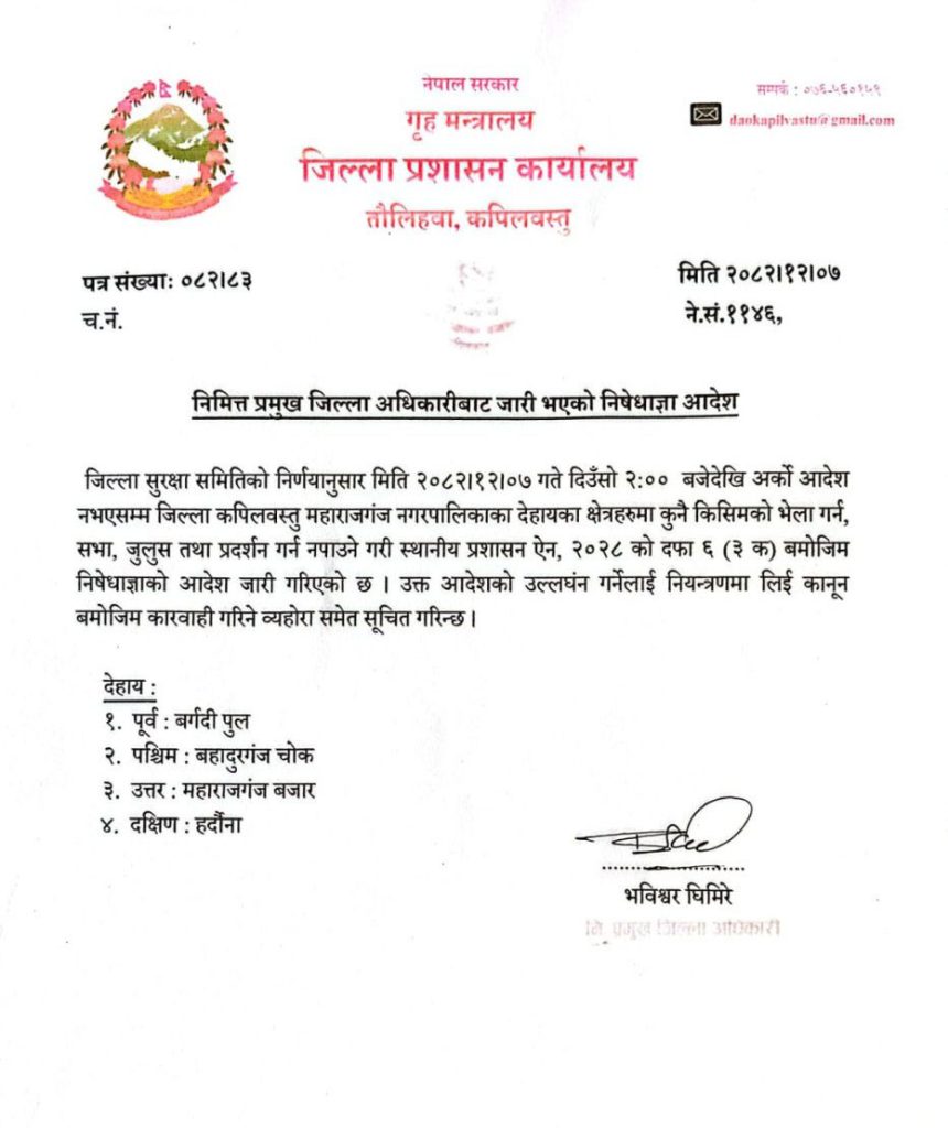 काठमाडौं । कपिलवस्तुको महाराजगञ्ज क्षेत्रमा हिन्दु र मुस्लिम समुदायबीच उत्पन्न तनाव बढ्न नदिन प्रशासनले निषेधाज्ञा लागू गरेको छ । जिल्ला प्रशासन कार्यालयले दिउँसो २ः०० बजेदेखि लागू हुने गरी विभिन्न स्थानमा भेला, सभा, जुलुस तथा प्रदर्शनमा रोक लगाएको हो ।