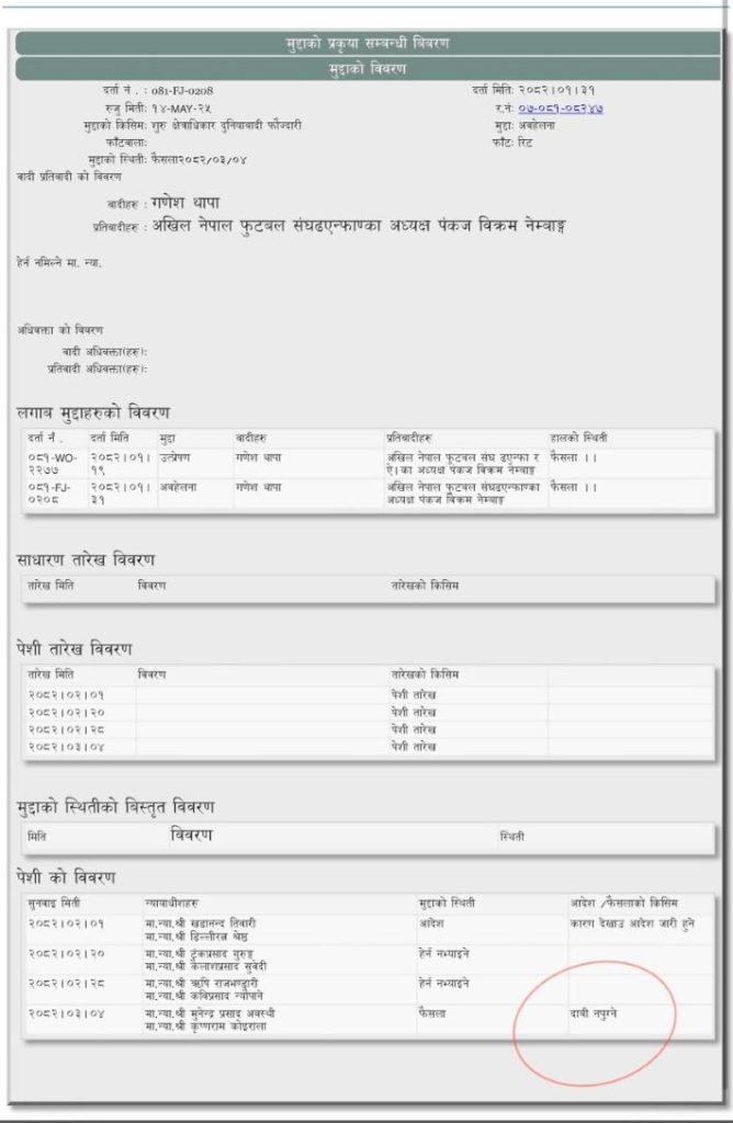 गणेश थापाले १९ वैशाखमा एन्फा र अध्यक्ष पङ्कज विक्रम नेम्बाङ विरुद्ध साधारण सभाको वैधानिकता र आफ्नो सहभागिताको अधिकार माग गर्दै रिट दायर गरेका थिए । साथै, ३१ वैशाखमा अदालतको अवहेलना भएको दाबी गर्दै अर्को रिट दर्ता गरेका थिए । तर अदालतले दाबी अपुरो भएको ठहर गर्दै दुवै रिट खारेज गरिदिएको हो । गणेश थापासम्बन्धी मुद्दामा भने ४ असारमै फैसला भइसकेको थियो ।